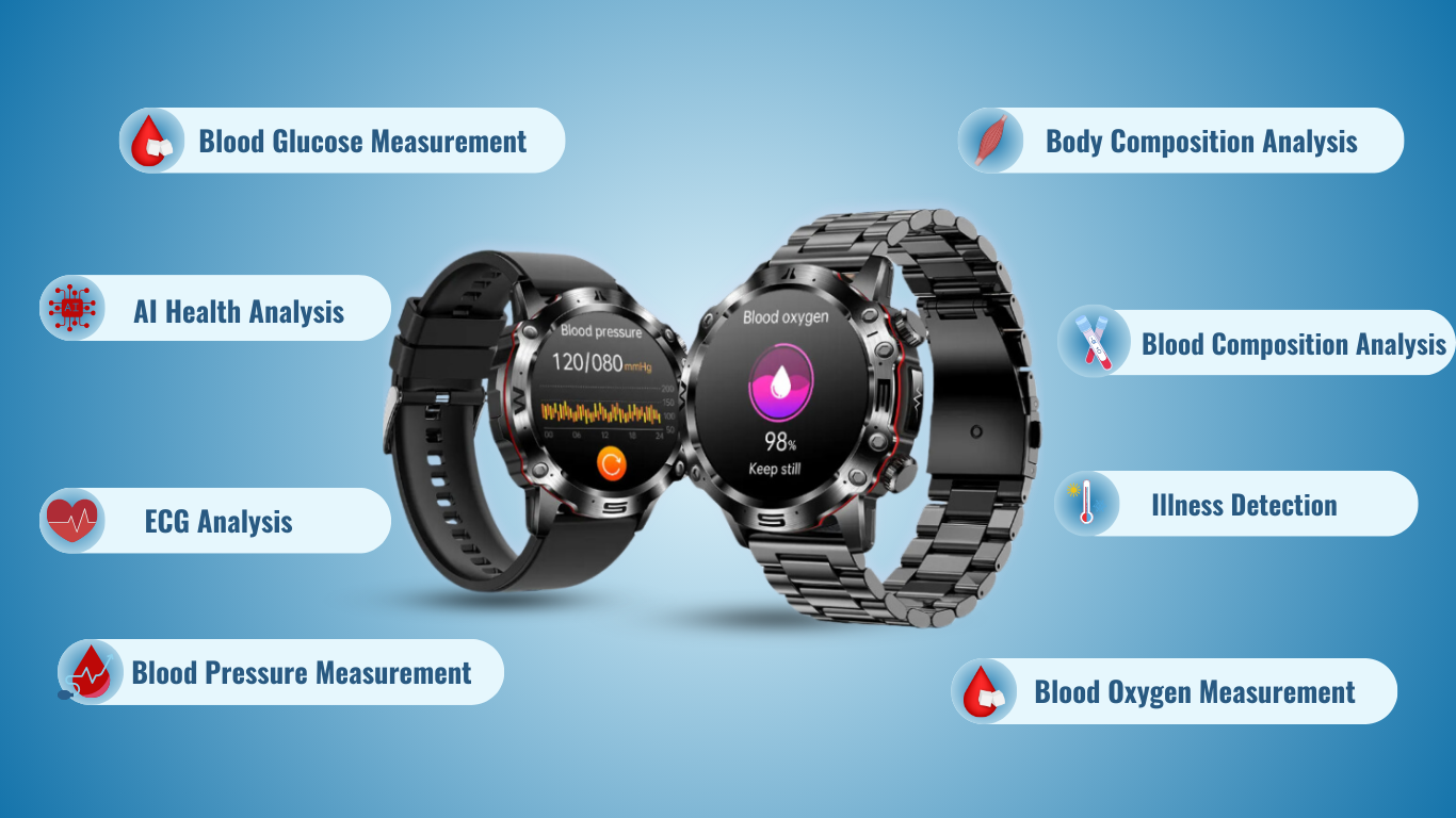 The AI Life Watch utilizes advanced non-invasive technology, based on optical sensors and LLT laser technology, for health monitoring. This includes photoplethysmography (PPG) sensors for tracking heart rate and blood oxygen levels, and a specialized non-invasive laser-based method for blood glucose monitoring. The PPG sensors use light-based technology to measure the rate of blood flow, which is then analyzed to provide heart rate and oxygen saturation data. For blood glucose levels, the watch employs a sophisticated laser technique that analyzes the skin's properties without the need for blood samples, offering a pain-free and convenient way to monitor glucose levels. This integration of non-invasive laser and optical technologies ensures accurate health tracking while maintaining user comfort and convenience.